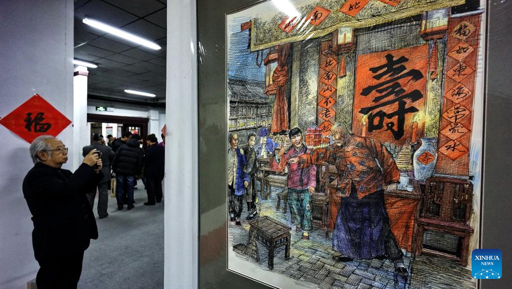 Yang Xin (C) instructs young hobbyists of traditional Beijing paintings in sketching from life in Beijing, capital of China, Dec. 30, 2023. (Xinhua/Li Xin)