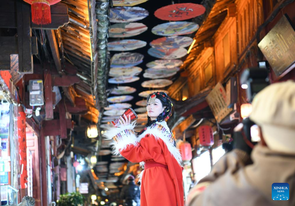 Tourists in ethnic costumes pose for photos at Lijiang ancient town, southwest China's Yunnan Province, Jan. 7, 2024. Yunnan has attracted legions of tourists this winter due to its mild climate. (Photo by Zhao Qingzu/Xinhua)