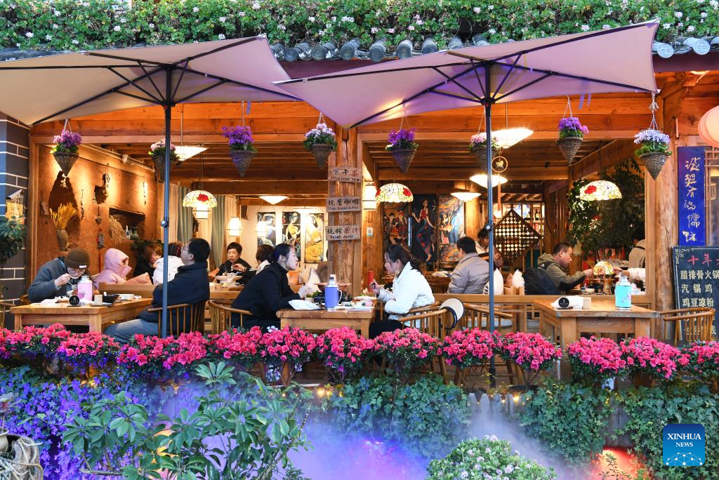 Tourists enjoy food at Lijiang ancient town, southwest China's Yunnan Province, Jan. 7, 2024. Yunnan has attracted legions of tourists this winter due to its mild climate. (Photo by Zhao Qingzu/Xinhua)