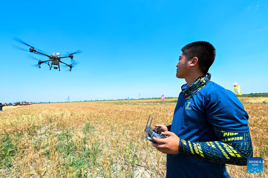 A technician operates an unmanned aerial vehicle (UAV) for plant protection during an activity organized by the local government to demonstrate agricultural machines in Caigongzhuang Township of Jinghai District, north China's Tianjin, June 11, 2023. (Xinhua/Sun Fanyue)
