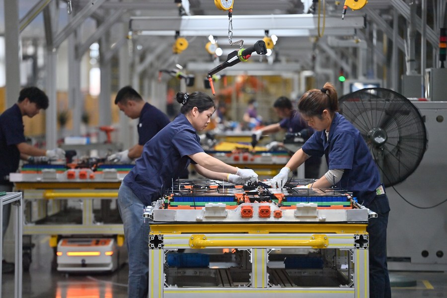 Technicians work on a production line of a new energy vehicle battery manufacturer in Liuzhou, south China's Guangxi Zhuang Autonomous Region, May 10, 2023. (Xinhua/Huang Xiaobang)