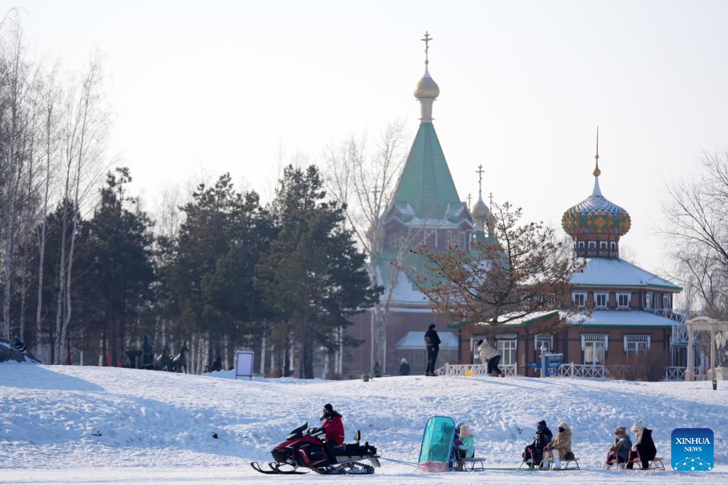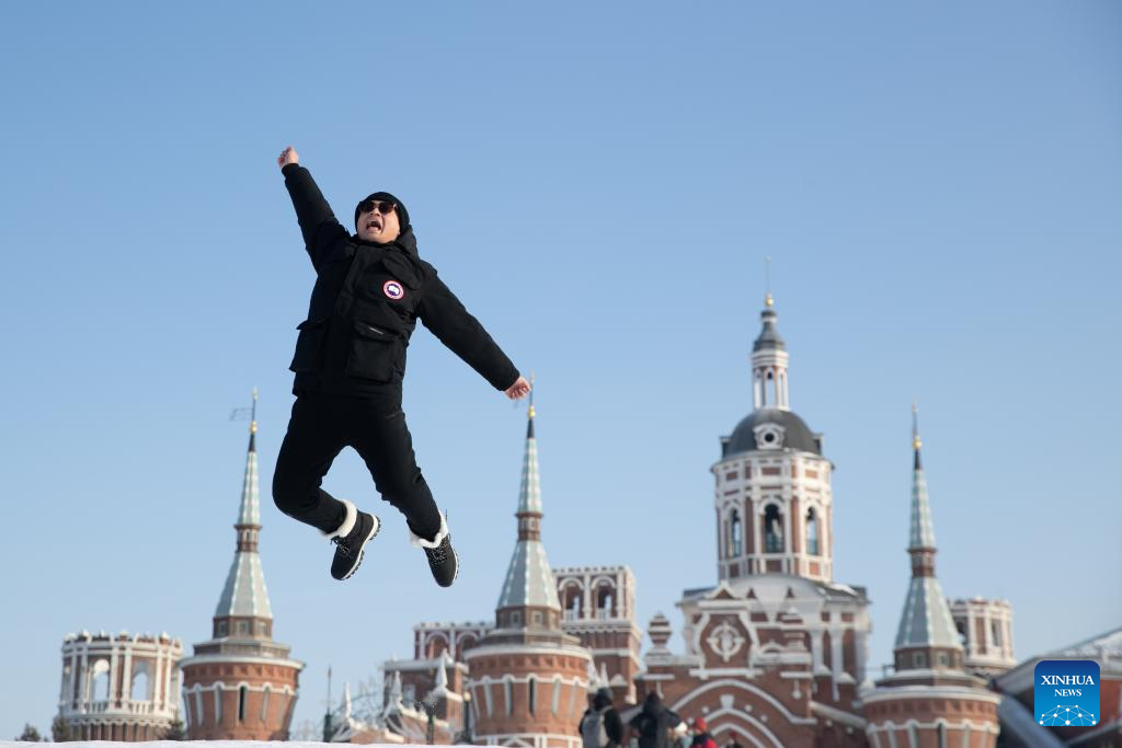 People enjoy themselves at the Volga Manor in Harbin, northeast China's Heilongjiang Province, Jan. 7, 2024. The Volga Manor, a Russian culture-themed park, turned into a world of ice and snow during the winter time, attracting lots of visitors. (Xinhua/Wang Jianwei)