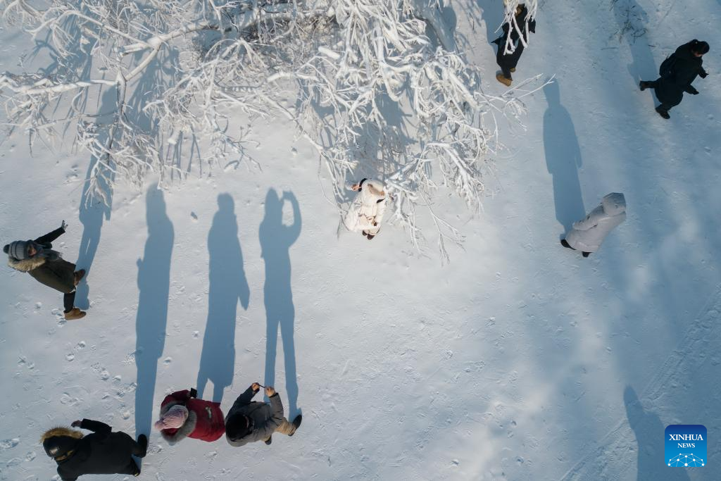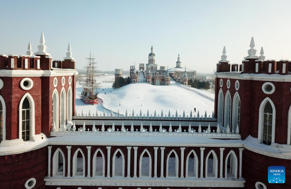 This aerial photo taken on Jan. 7, 2024 shows people visiting the Volga Manor in Harbin, northeast China's Heilongjiang Province. The Volga Manor, a Russian culture-themed park, turned into a world of ice and snow during the winter time, attracting lots of visitors. (Xinhua/Wang Jianwei)