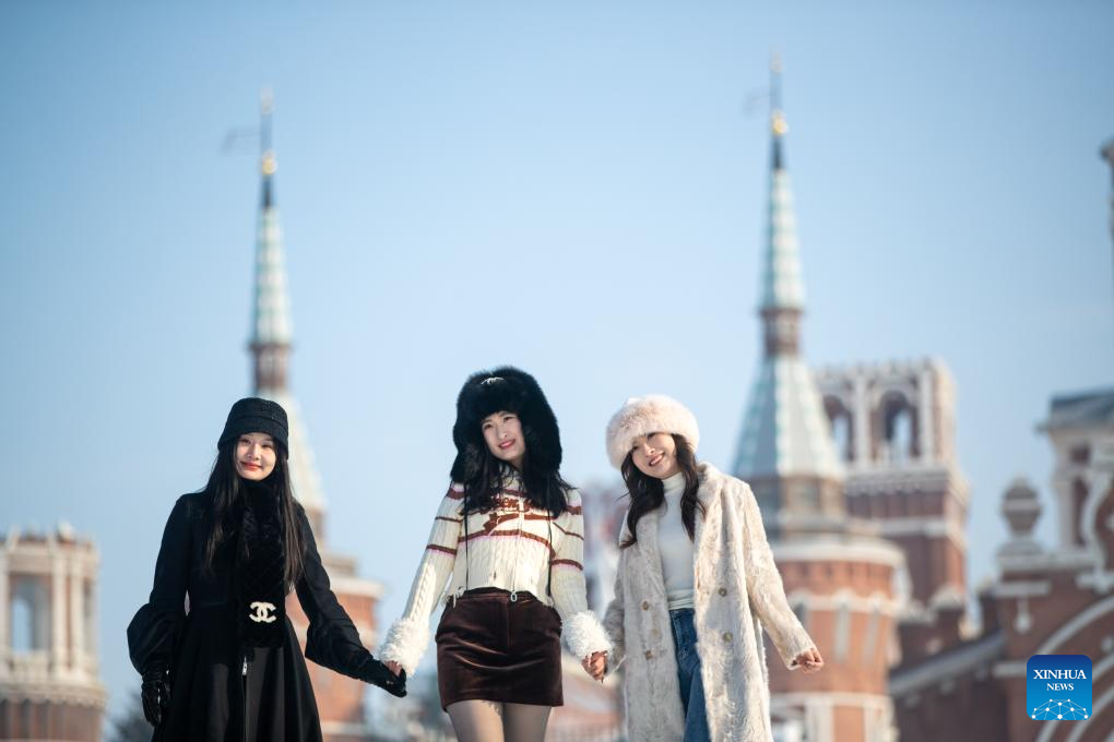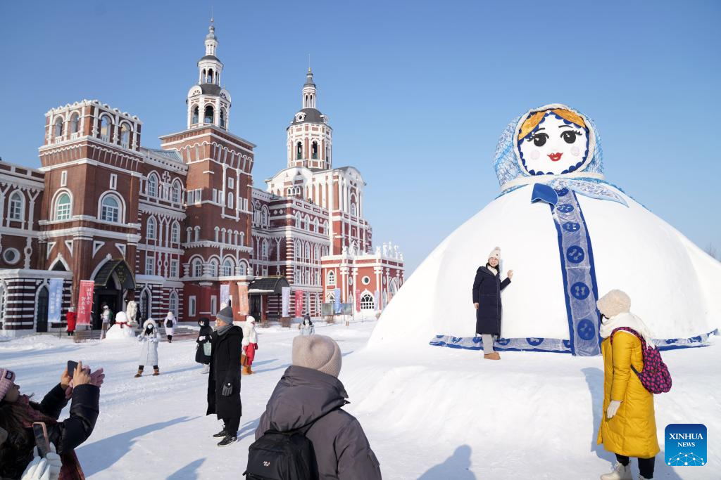 People pose for photos at the Volga Manor in Harbin, northeast China's Heilongjiang Province, Jan. 7, 2024. The Volga Manor, a Russian culture-themed park, turned into a world of ice and snow during the winter time, attracting lots of visitors. (Xinhua/Zhang Tao)