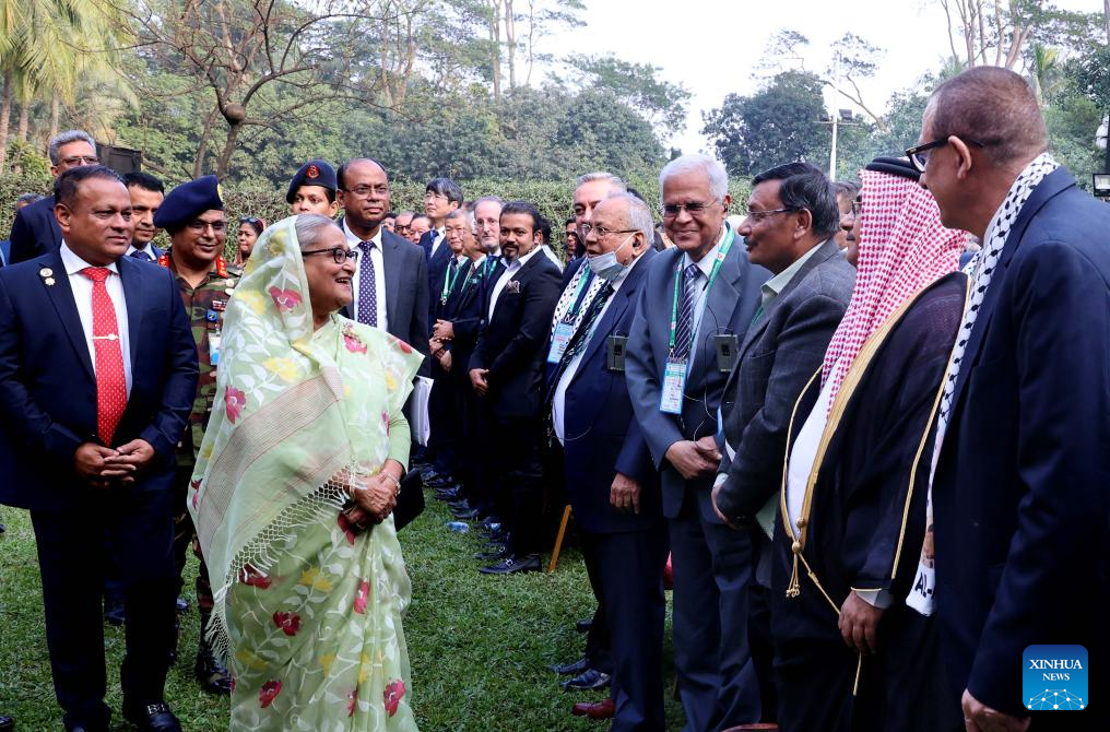 Bangladeshi Prime Minister Sheikh Hasina (2nd L, Front) exchanges greetings with people at a meeting in Dhaka, Bangladesh, on Jan. 8, 2024. The ruling Bangladeshi Awami League (AL) party led by Prime Minister Sheikh Hasina has won 223 out of 298 seats in the country's parliamentary elections, according to the Chief Election Commissioner Kazi Habibul Awal on Monday. (PMO/Handout via Xinhua)