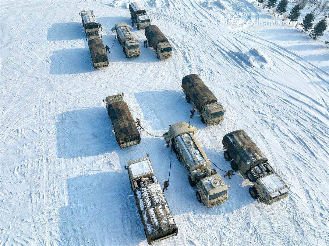 Soldiers assigned to a transport brigade of the Chinese People's Liberation Army Joint Logistic Support Force refuel transport vehicles on January 2 during their first training exercise in 2024. (eng.chinamil.com.cn/Photo by Xu Yongzheng)