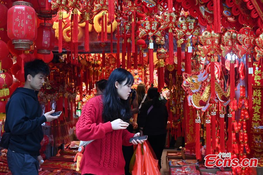 People shop Spring Festival decorations at a market in Guangzhou, south China's Guangdong Province, Jan. 8, 2024. (Photo: China News Service/Chen Chuhong)