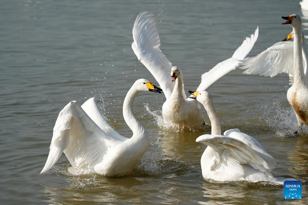 White swans forage at Pinglu Yellow River Wetland in Pinglu County of Yuncheng, north China's Shanxi Province, Jan. 9, 2024. The Pinglu Yellow River Wetland, covering over 6,000 hectares, has a pleasant climate and abundant food, and is one of China's winter habitats for white swans. (Xinhua/Zhan Yan)