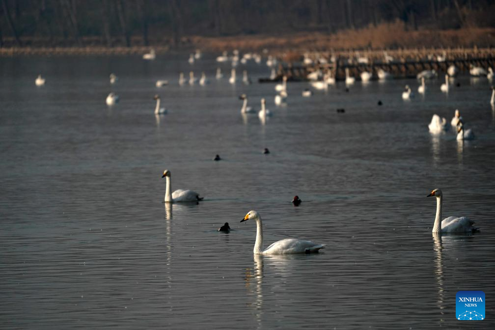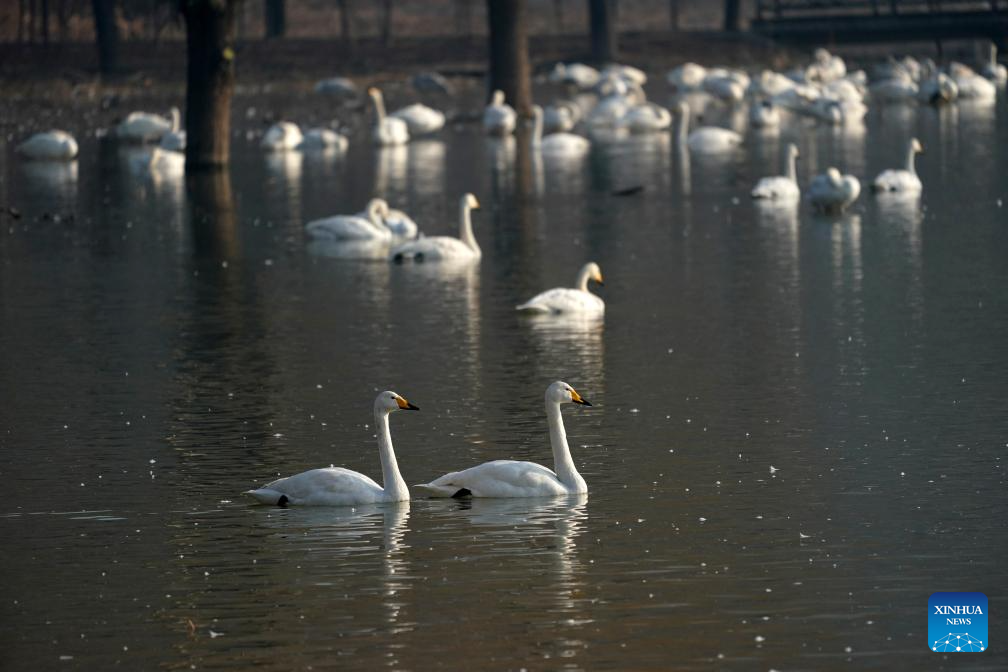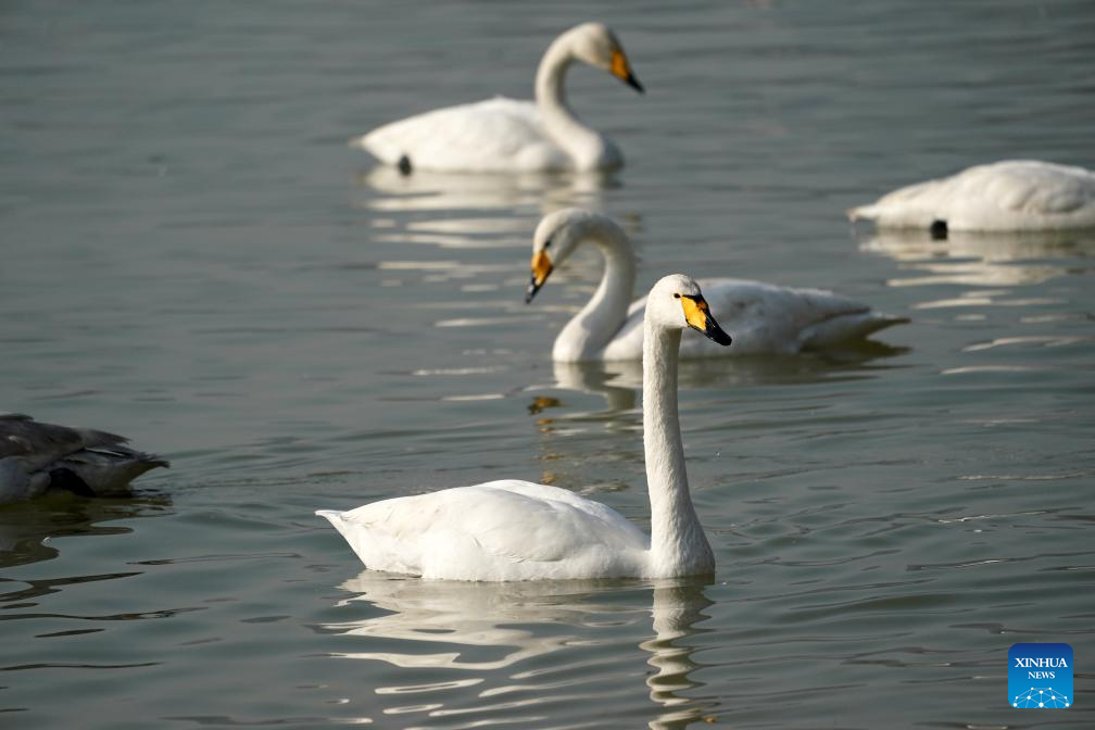 White swans are seen at Pinglu Yellow River Wetland in Pinglu County of Yuncheng, north China's Shanxi Province, Jan. 9, 2024. The Pinglu Yellow River Wetland, covering over 6,000 hectares, has a pleasant climate and abundant food, and is one of China's winter habitats for white swans. (Xinhua/Zhan Yan)