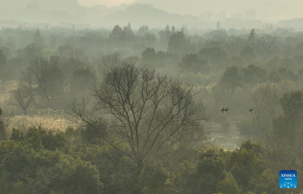 This aerial photo taken on Jan. 9, 2024 shows waterfowls flying over the Xixi Wetland in Hangzhou, east China's Zhejiang Province. (Xinhua/Weng Xinyang)