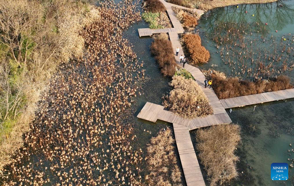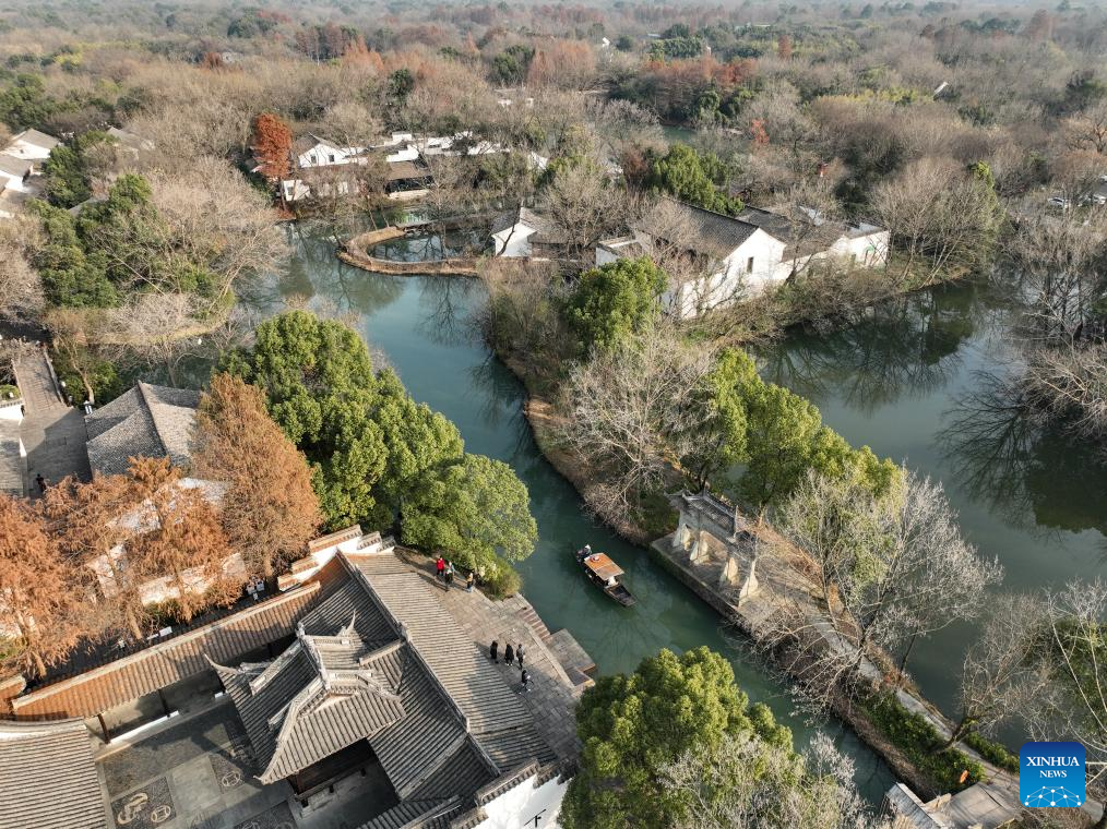 This aerial photo taken on Jan. 9, 2024 shows tourists visiting the Xixi Wetland in Hangzhou, east China's Zhejiang Province. (Xinhua/Weng Xinyang)