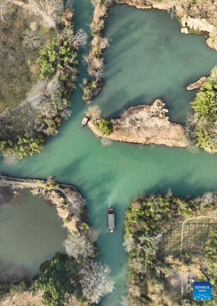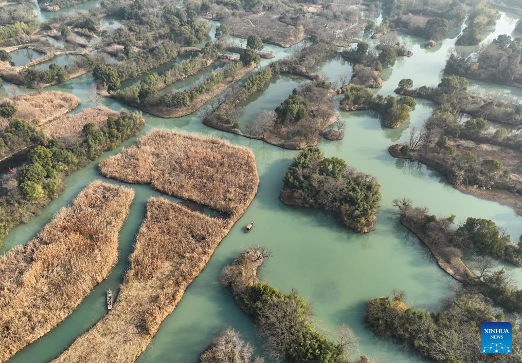 This aerial photo taken on Jan. 9, 2024 shows boats sailing at the Xixi Wetland in Hangzhou, east China's Zhejiang Province. (Xinhua/Weng Xinyang)