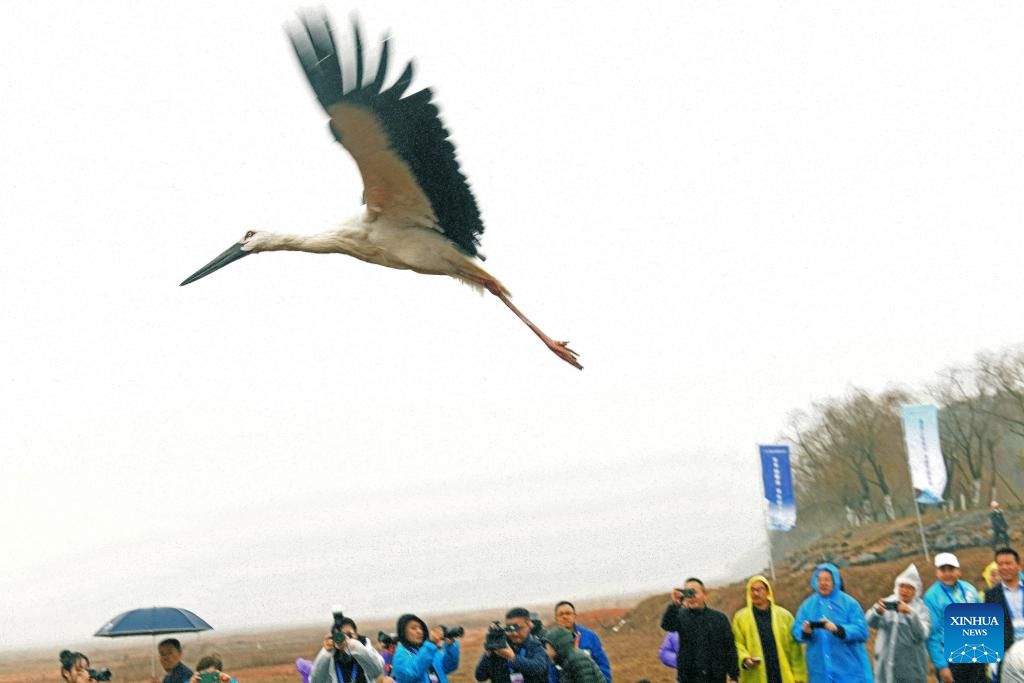 Staff members release oriental white storks and other birds into the wild at Poyang Lake Wetland Park in Poyang County of Shangrao City, east China's Jiangxi Province, Jan. 8, 2024. (Photo by Zhuo Zhongwei/Xinhua)