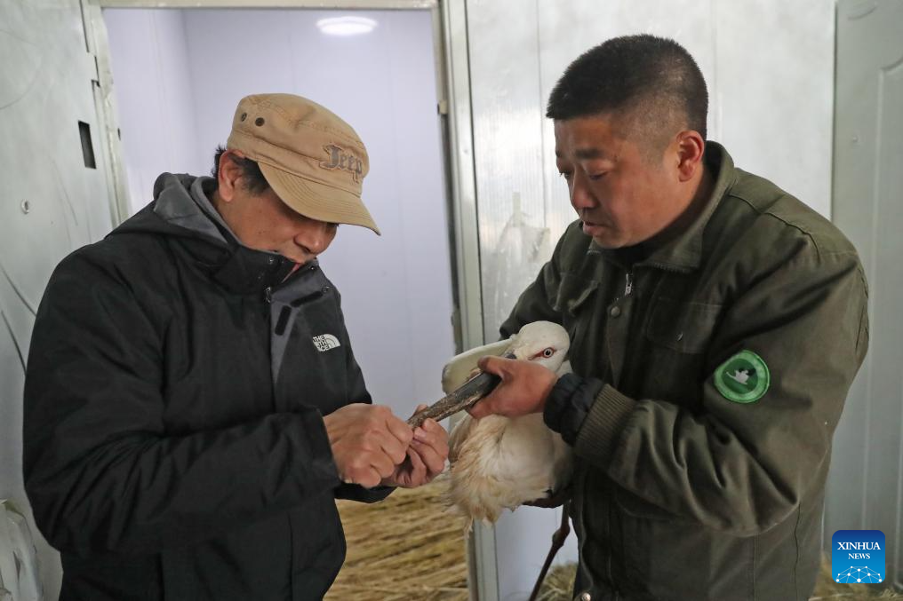 Staff members check the condition of an oriental white stork at Shenyang Raptor Rescue Center in Shenyang, northeast China's Liaoning Province, Jan. 5, 2024. (Xinhua/Yang Qing)