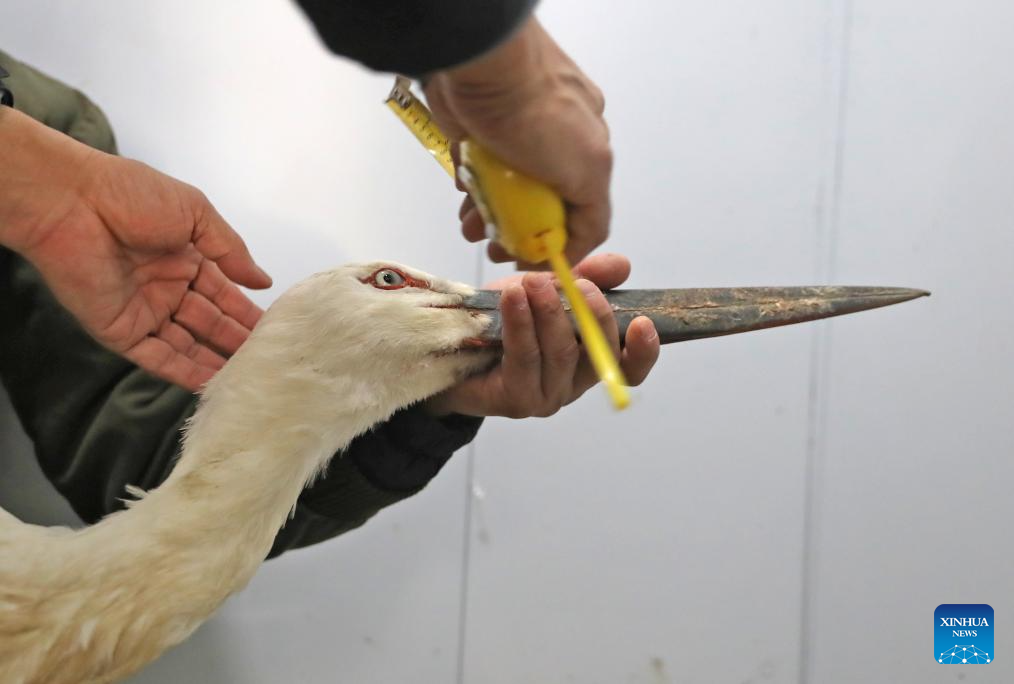 A staff member measures the beak length of an oriental white stork at Shenyang Raptor Rescue Center in Shenyang, northeast China's Liaoning Province, Jan. 5, 2024. (Xinhua/Yang Qing)
