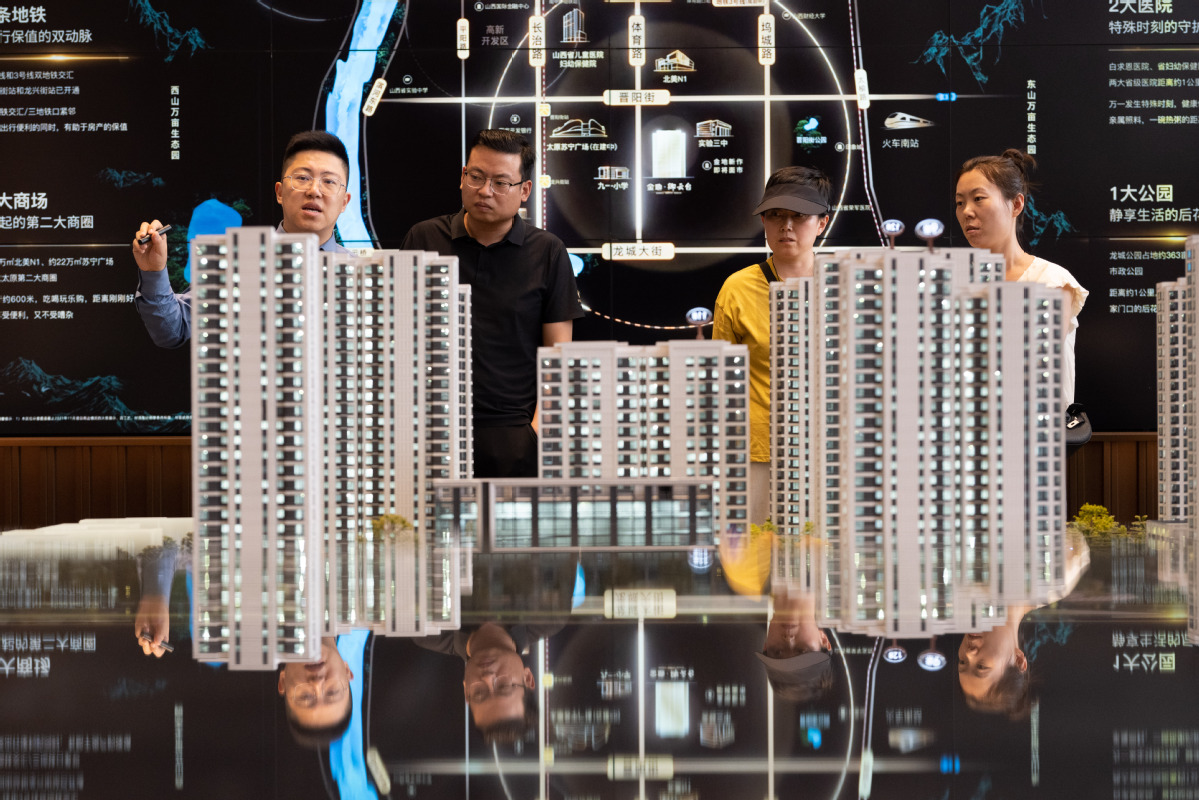 A salesman (left) introduces a residential project to potential homebuyers in Taiyuan, Shanxi Province, on July 14, 2023. WEI LIANG/CHINA NEWS SERVICE