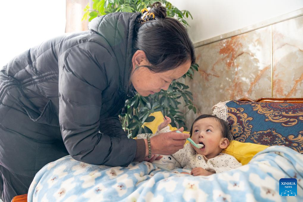 Pasang feeds a baby at a welfare house in Xigaze, southwest China's Xizang Autonomous Region, Jan. 8, 2024. (Photo by Tenzin Nyida/Xinhua)