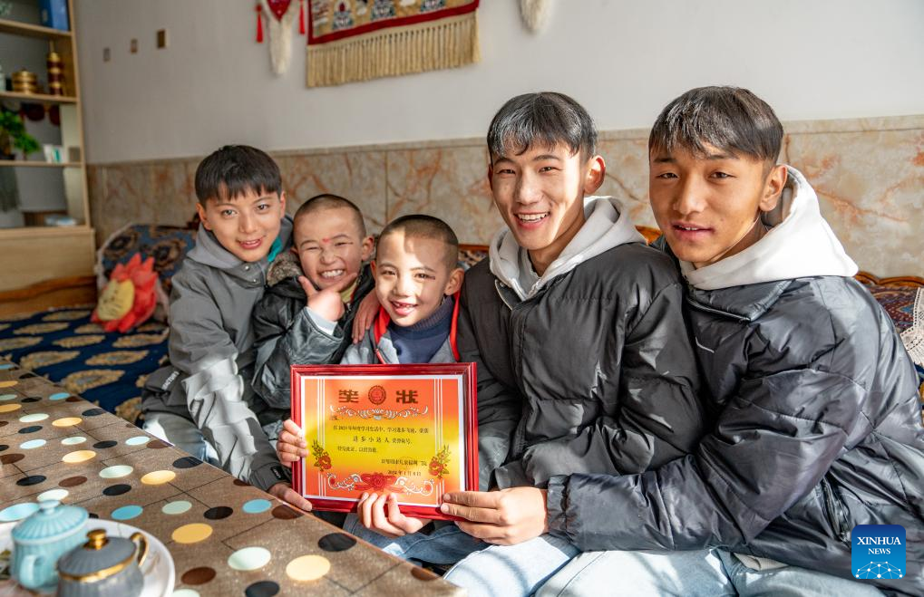 Children pose for photos with a certificate of merit at a welfare house in Xigaze, southwest China's Xizang Autonomous Region, Jan. 8, 2024. (Photo by Tenzin Nyida/Xinhua)