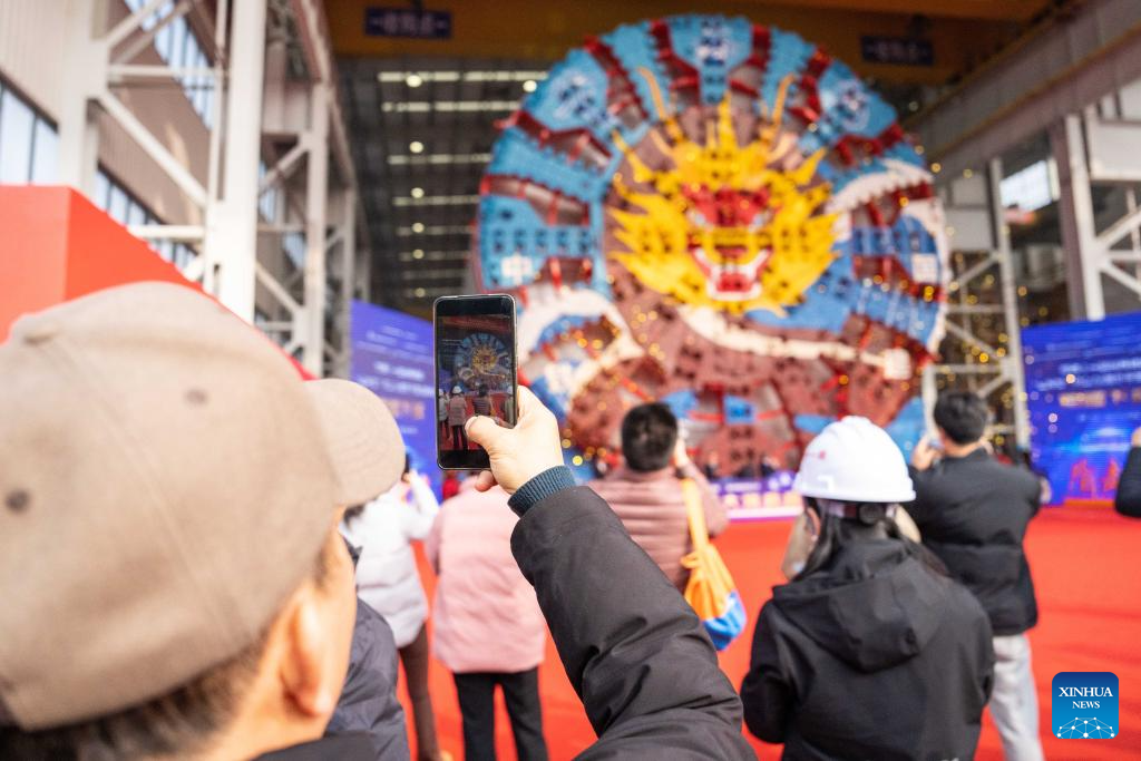 Workers record the tunnel boring machine (TNM) Dinghai at an industrial park of China Railway Construction Heavy Industry Corporation Limited in Changsha, central China's Hunan Province, Jan. 10, 2024. With a diameter of 14.57 meters and a total weight of 4,350 tonnes, the TNM Dinghai will be used in the construction of Jintang undersea tunnel linking the Jintang islet of Zhoushan and the coastal area of Ningbo. (Xinhua/Chen Sihan)