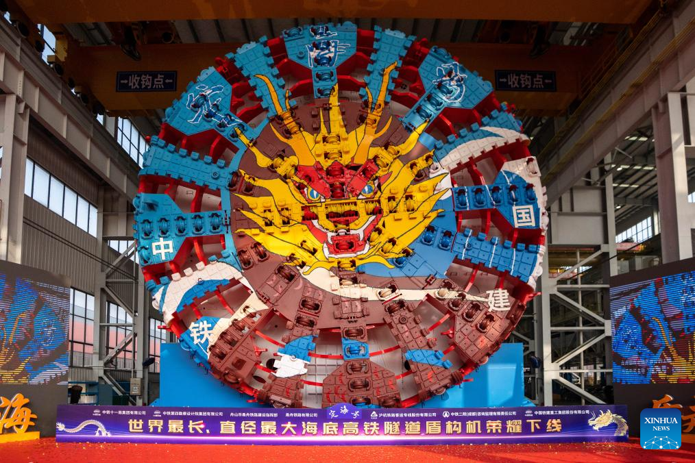 The tunnel boring machine (TNM) Dinghai is seen at an industrial park of China Railway Construction Heavy Industry Corporation Limited in Changsha, central China's Hunan Province, Jan. 10, 2024. With a diameter of 14.57 meters and a total weight of 4,350 tonnes, the TNM Dinghai will be used in the construction of Jintang undersea tunnel linking the Jintang islet of Zhoushan and the coastal area of Ningbo. (Xinhua/Chen Sihan)