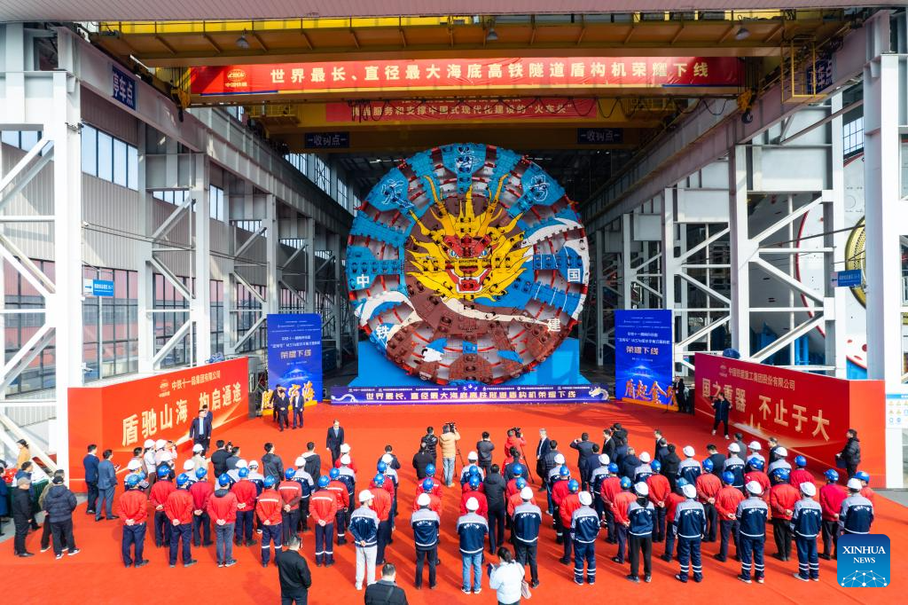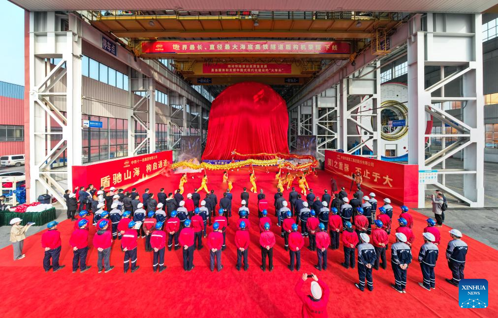 Workers attend an unveiling ceremony of the tunnel boring machine (TNM) Dinghai at an industrial park of China Railway Construction Heavy Industry Corporation Limited in Changsha, central China's Hunan Province, Jan. 10, 2024. With a diameter of 14.57 meters and a total weight of 4,350 tonnes, the TNM Dinghai will be used in the construction of Jintang undersea tunnel linking the Jintang islet of Zhoushan and the coastal area of Ningbo. (Xinhua/Chen Sihan)