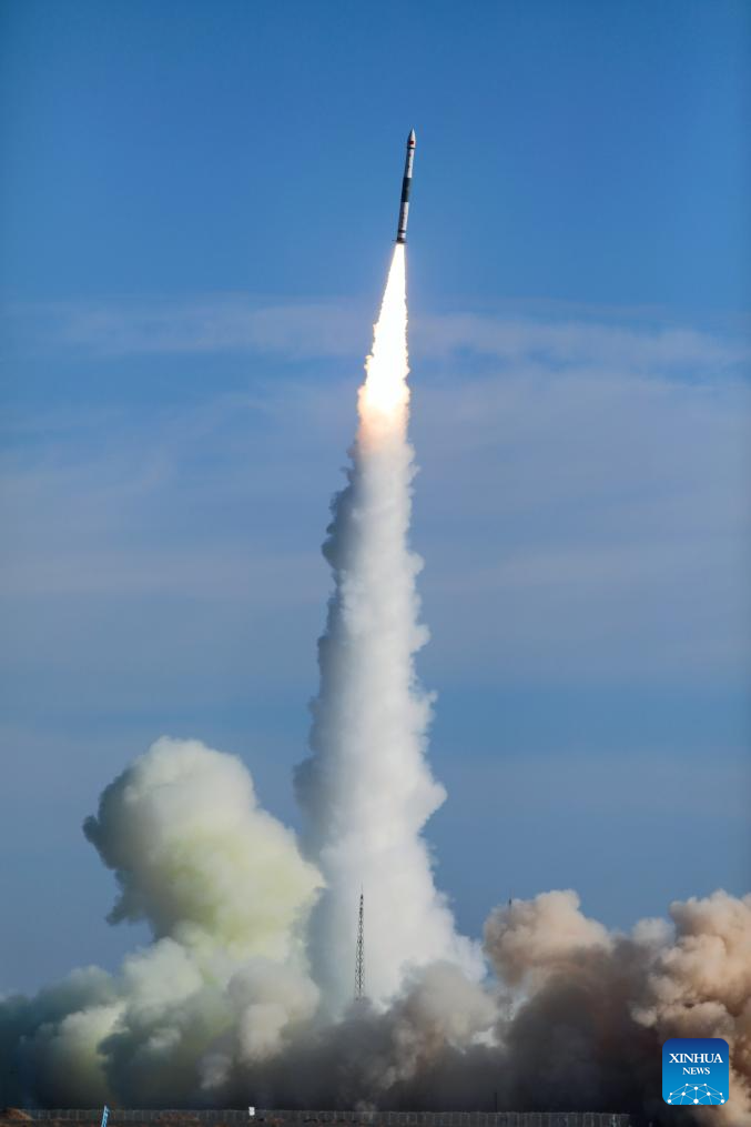 A Kuaizhou-1A carrier rocket carrying the Tianxing-1 02 satellite blasts off from the Jiuquan Satellite Launch Center in northwest China, Jan. 11, 2024. The satellite, mainly used for experiments such as space environment detection, was launched at 11:52 a.m. (Beijing Time) and has entered the planned orbit. (Photo by Yang Xiaobo/Xinhua)