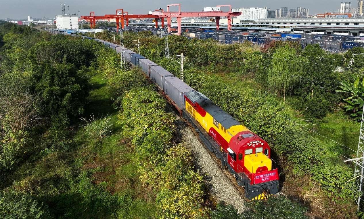 A freight train departs from Chengdu, southwest China's Sichuan province for Thailand, Nov. 17, 2023. (People's Daily Online/Bai Guibin)