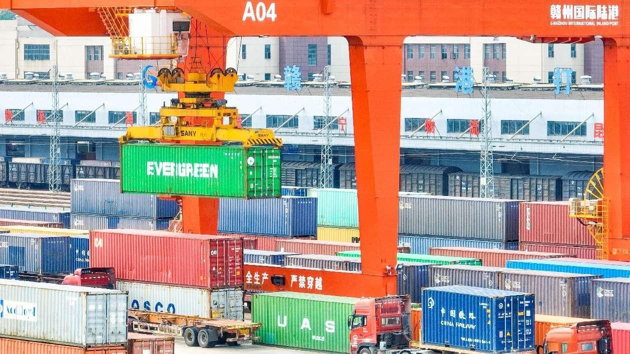 A container is hoisted by cranes at an international land port in Ganzhou, east China's Jiangxi province. (People's Daily Online/Hu Jiangtao)