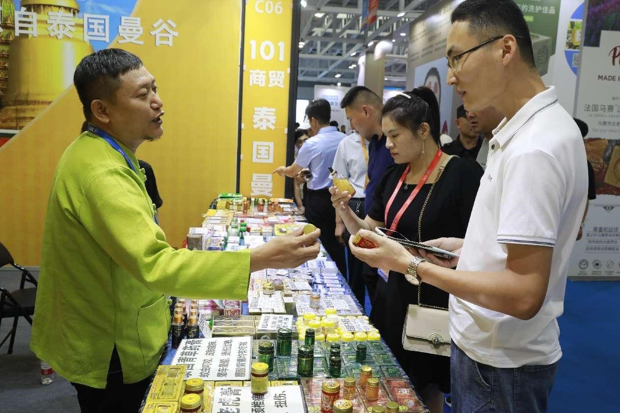 A Thai merchant sells products at the third RCEP (Shandong) Import Expo in Linyi, east China's Shandong province, Aug. 18, 2023. (People's Daily Online/Sun Lei)