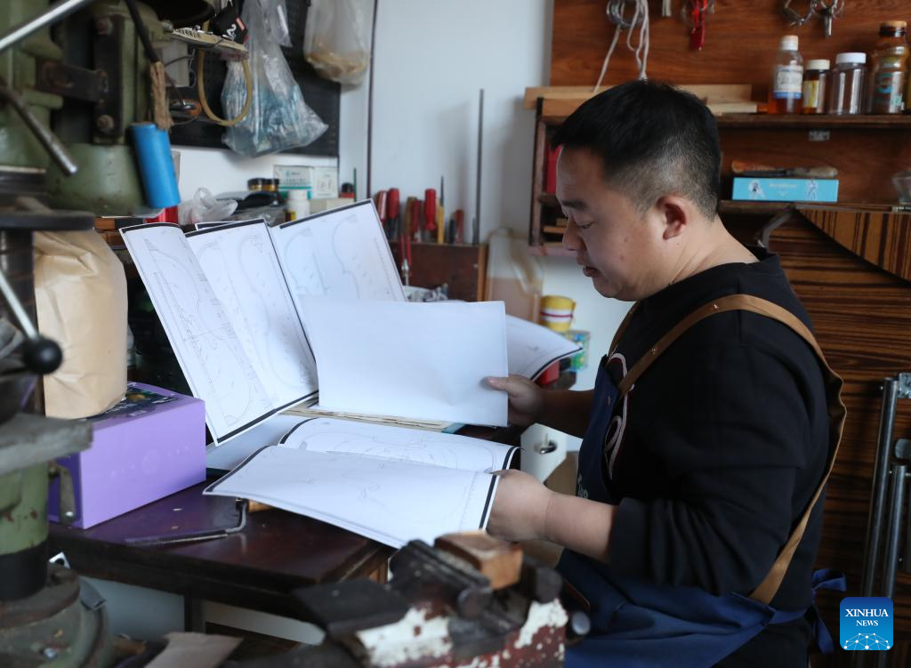 Yu Haixu looks at violin blueprints at his studio in Yingkou, northeast China's Liaoning Province on Jan. 9, 2024.(Xinhua/Yang Qing)