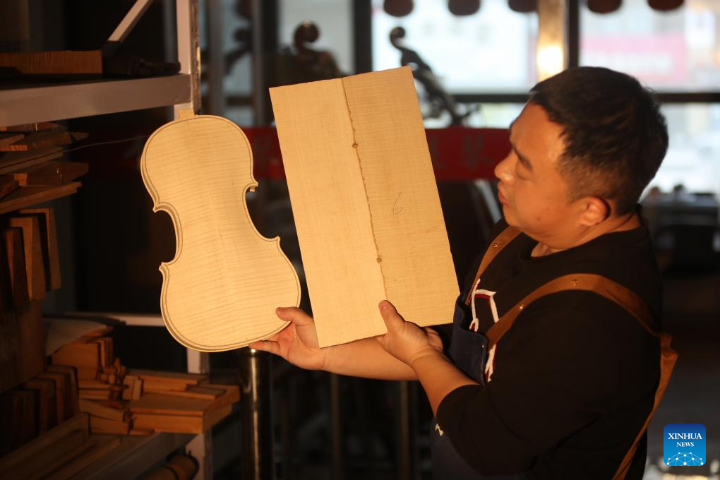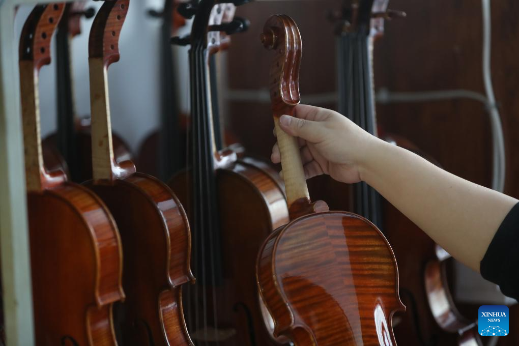 Yu Haixu checks the painting on the surface of a violin at his studio in Yingkou, northeast China's Liaoning Province on Jan. 9, 2024.(Xinhua/Yang Qing)