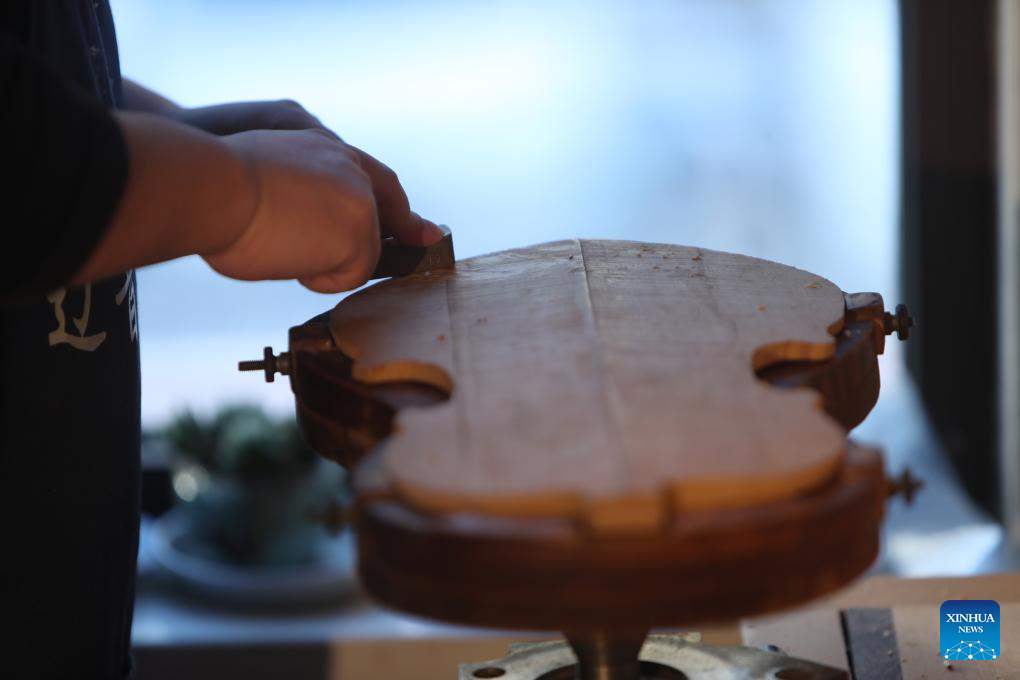 Yu Haixu makes a violin at his studio in Yingkou, northeast China's Liaoning Province on Jan. 9, 2024. (Xinhua/Yang Qing)
