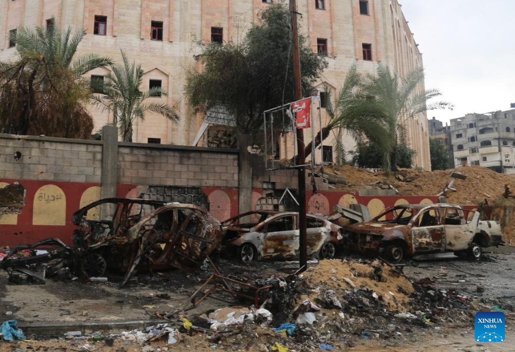 Photo taken on Jan. 11, 2024 shows damaged vehicles in the northern Gaza Strip town of Beit Lahia. The Palestinian death toll from ongoing Israeli attacks on the Gaza Strip has risen to 23,469, the Gaza-based Health Ministry said on Thursday. (Photo by Abdul Rahman Salama/Xinhua)