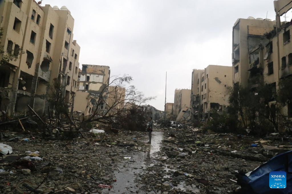 Photo taken on Jan. 11, 2024 shows damaged buildings in the northern Gaza Strip town of Beit Lahia. The Palestinian death toll from ongoing Israeli attacks on the Gaza Strip has risen to 23,469, the Gaza-based Health Ministry said on Thursday. (Photo by Abdul Rahman Salama/Xinhua)