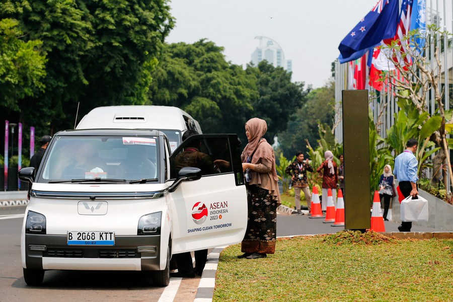 A Wuling Air electric vehicle is seen outside the venue of the 43rd Association of Southeast Asian Nations (ASEAN) Summit in Jakarta, Indonesia, Sept. 7, 2023. (Xinhua/Wang Yiliang)