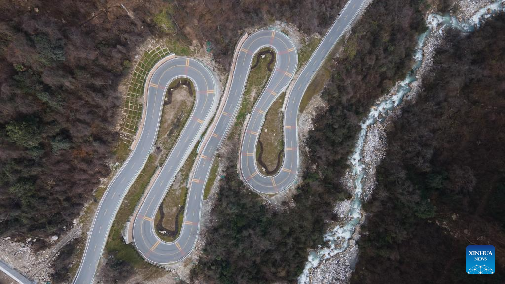 An aerial drone photo taken on Jan. 10, 2024 shows a view of a mountain road at Hailuogou scenic area in Garze Tibetan Autonomous Prefecture, southwest China's Sichuan Province. Hailuogou scenic area reopened to visitors on Dec. 12, 2023 with newly-built and upgraded infrastructure, over a year after a 6.8-magnitude earthquake forced its closure. (Xinhua/Xu Bingjie)