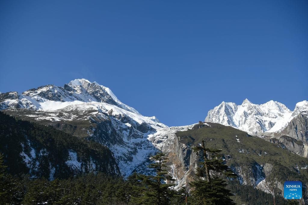 This photo taken on Jan. 10, 2024 shows a view of Mount Gongga glacier seen from Hailuogou scenic area in Garze Tibetan Autonomous Prefecture, southwest China's Sichuan Province. Hailuogou scenic area reopened to visitors on Dec. 12, 2023 with newly-built and upgraded infrastructure, over a year after a 6.8-magnitude earthquake forced its closure. (Xinhua/Xu Bingjie)