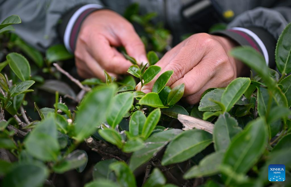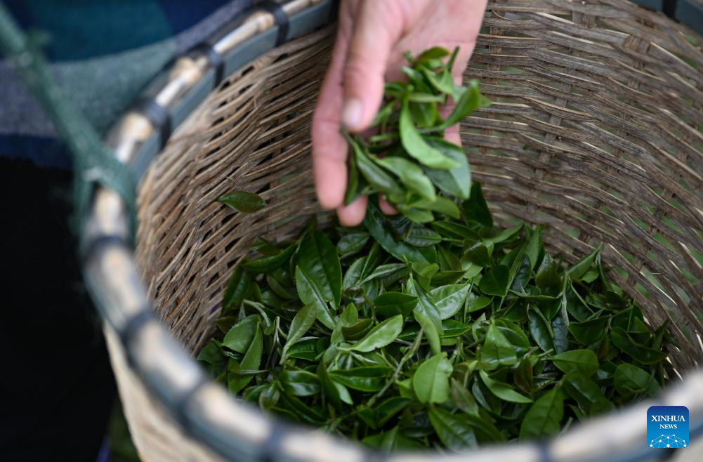 A farmer collects tea leaves at a tea garden in Wuzhishan, south China's Hainan Province, Jan. 11, 2024. Harvest period for the early spring tea has arrived in Wuzhishan of Hainan Province. (Xinhua/Guo Cheng)