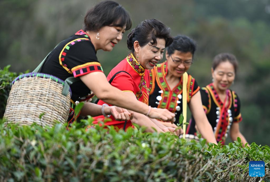 Tourists collect tea leaves at a tea garden in Wuzhishan, south China's Hainan Province, Jan. 11, 2024. Harvest period for the early spring tea has arrived in Wuzhishan of Hainan Province. (Xinhua/Guo Cheng)