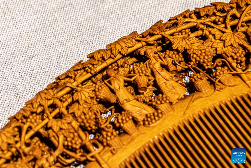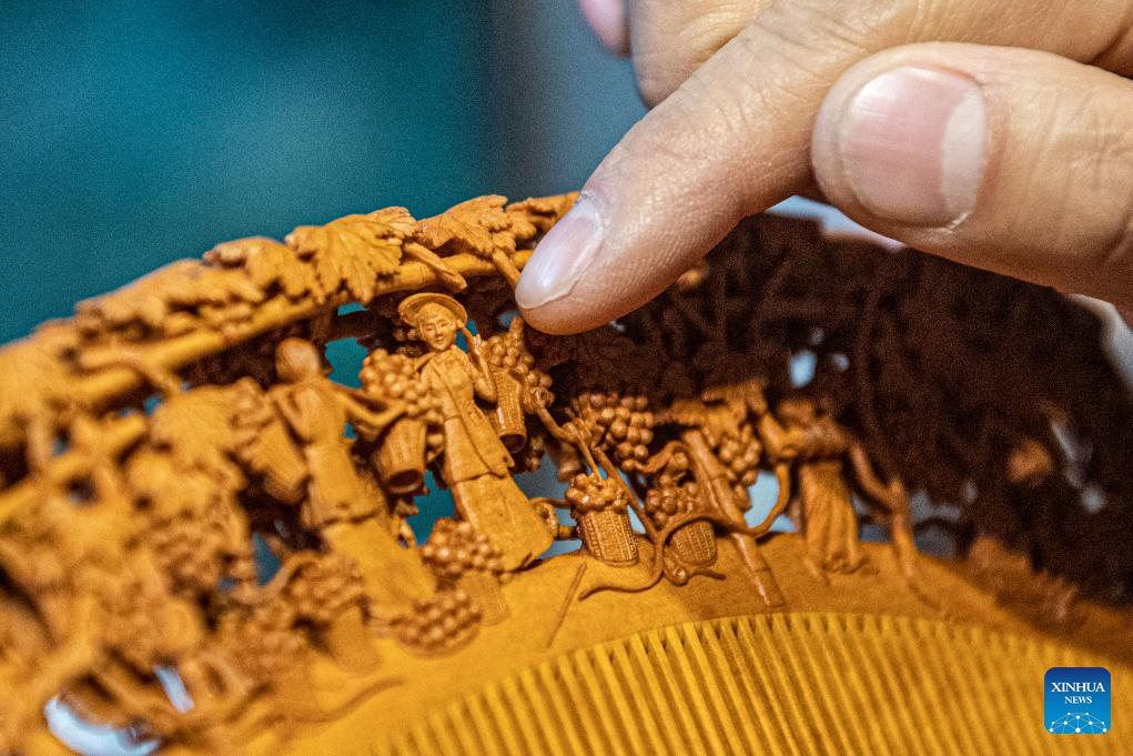 Yu Dahong, a representative inheritor of the art, set out on wood carving in 1989 when he was 13 years old. Having engaged in the art for over 30 years, he has made numerous comb artworks that earned him various medals at the national and provincial levels. Focusing on the research, preserving and innovation of the crafts, he puts his heart and soul into passing on his experiences to the apprentices nowadays. "As an inheritor, I have the responsibility of passing down the crafts," said Yu.