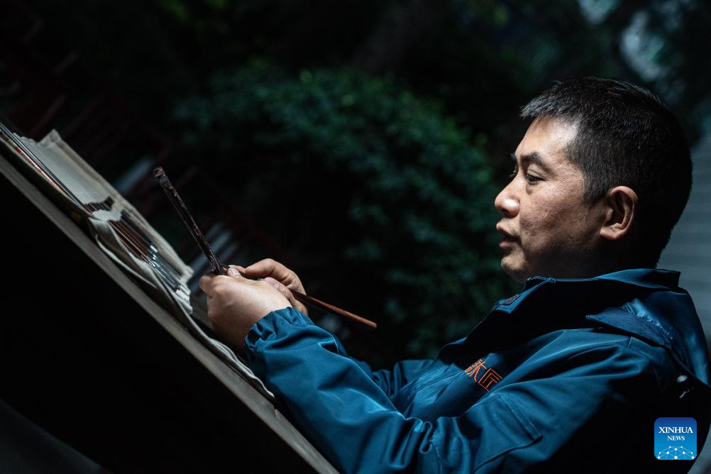 Yu Dahong engraves on a wooden comb at a workshop of Tanmujiang factory in Chongqing, southwest China, Jan. 5, 2024.(Xinhua/Tang Yi)