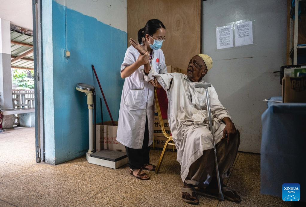 Pan Chunxi, head of the Chinese medical team to the Comoros, examines a patient at the El-Maarouf Hospital in Moroni, capital of the Comoros, Jan. 11, 2024. The medical team from south China's Guangxi Zhuang Autonomous Region arrived in the Comoros in 2022, providing medical services for local patients and training for local doctors. (Xinhua/Wang Guansen)