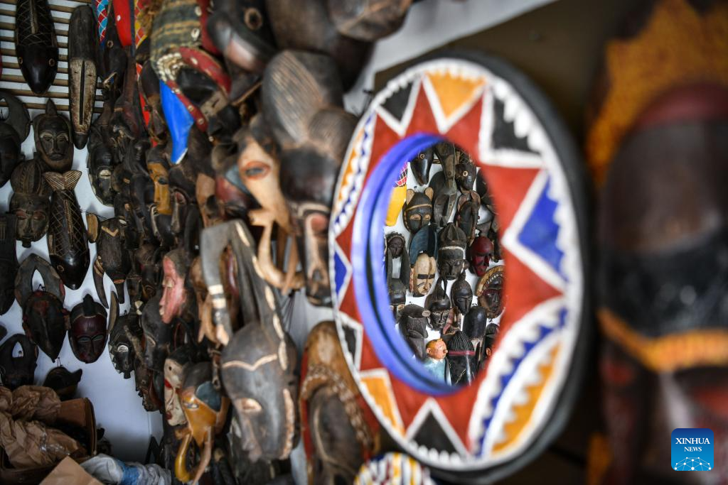 This photo taken on Jan. 12, 2024 shows artworks at a shop of a handicraft market in Abidjan, Cote d'Ivoire. (Xinhua/Han Xu)