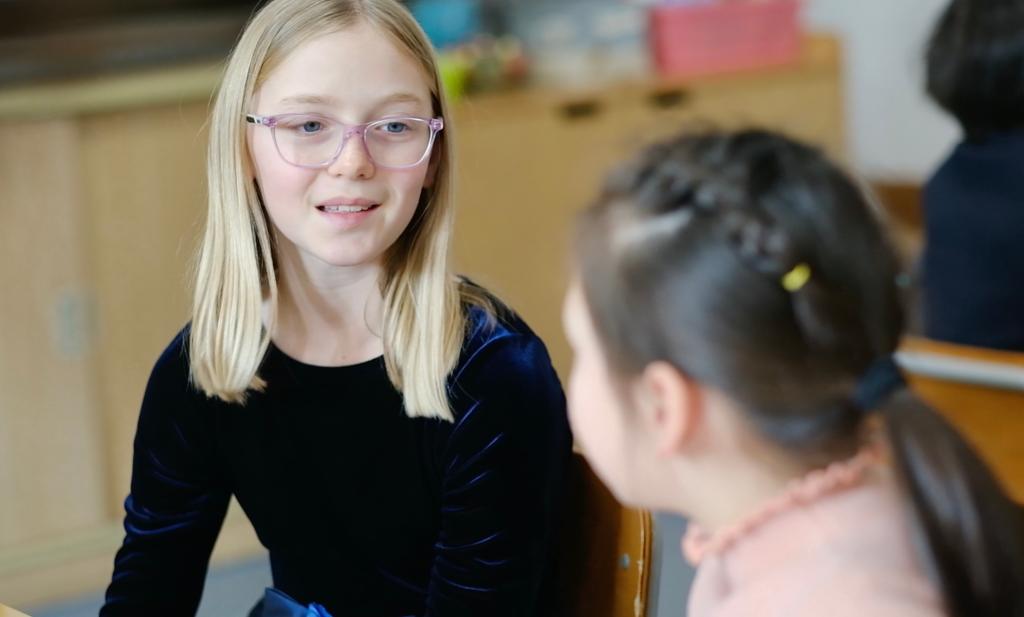 Miriam Gubler, a student of Utah's Cascade Elementary School, speaks with a student in Shanghai Soong Ching Ling School on Jan. 12, 2024. (Xinhua/Zheng Kaijun)