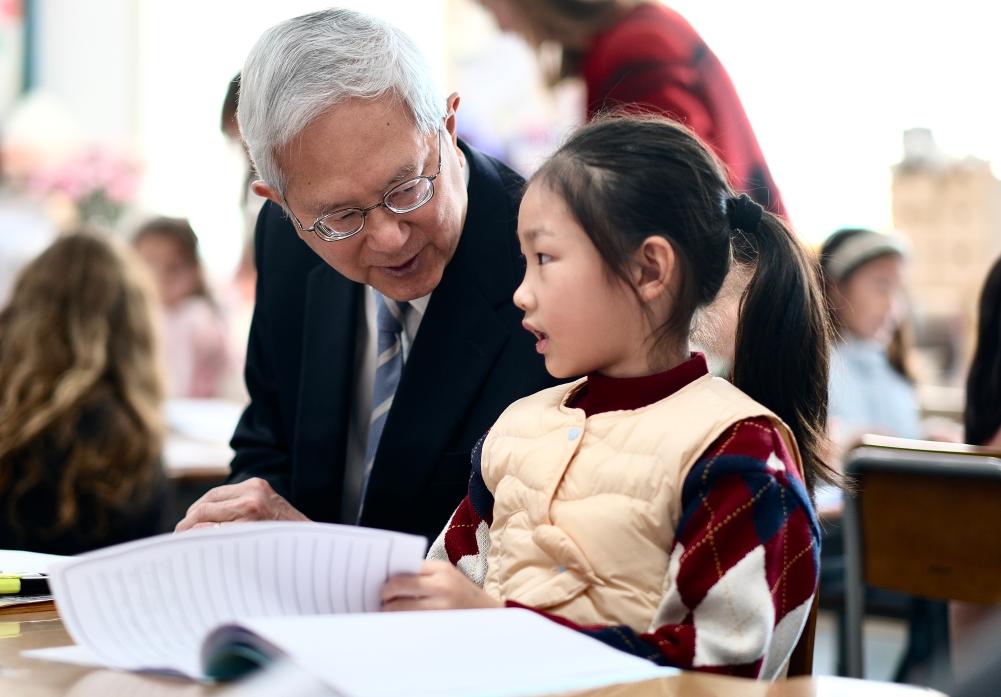 Gerrit W. Gong, a member of the friendship delegation from the U.S. state of Utah, speaks with a student in Shanghai Soong Ching Ling School on Jan. 12, 2024. (Xinhua/Zheng Kaijun)