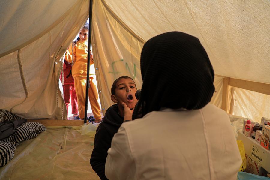 A doctor checks the condition of a boy at a temporary clinic in the southern Gaza Strip city of Rafah, on Jan. 8, 2024. (Photo by Rizek Abdeljawad/Xinhua)