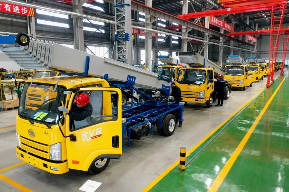 Ladder trucks manufactured by Qingdao Jiuhe Heavy Industry Machinery Co., Ltd. in east China's Shandong province go through inspection before being exported. (People's Daily Online/Liang Xiaopeng)