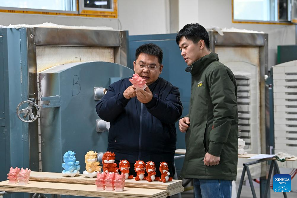 Li Yamin checks the finished products at a production base of Honglyucai (Red and Green Color) Porcelain in Honglyucai Village, Changzhi City of north China's Shanxi Province, Jan. 3, 2024.(Xinhua/Yang Chenguang)