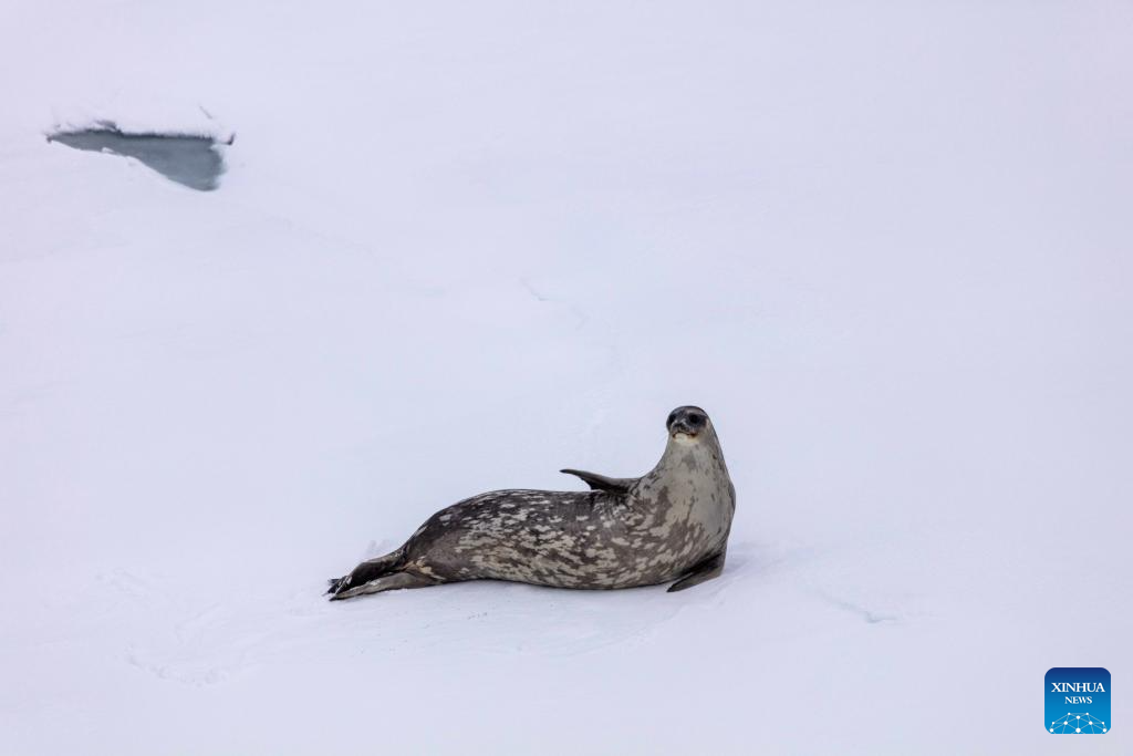 This photo taken on Jan. 8, 2024 shows a seal in the Amundsen Sea. China's research icebreaker Xuelong 2 is conducting an Antarctic expedition in the Amundsen Sea, where various animals can be spotted. (Xinhua/Zhou Yuan)