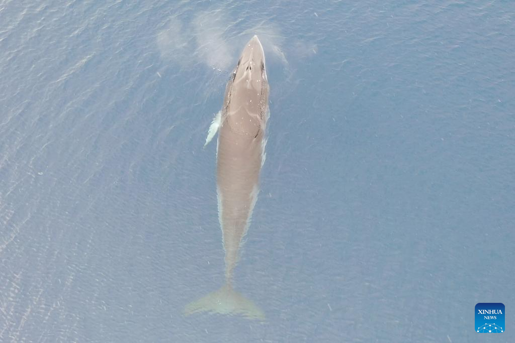 An aerial drone photo taken on Jan. 6, 2024 shows a minke whale in the Amundsen Sea. China's research icebreaker Xuelong 2 is conducting an Antarctic expedition in the Amundsen Sea, where various animals can be spotted. (Photo by Chen Dongbin/Xinhua)